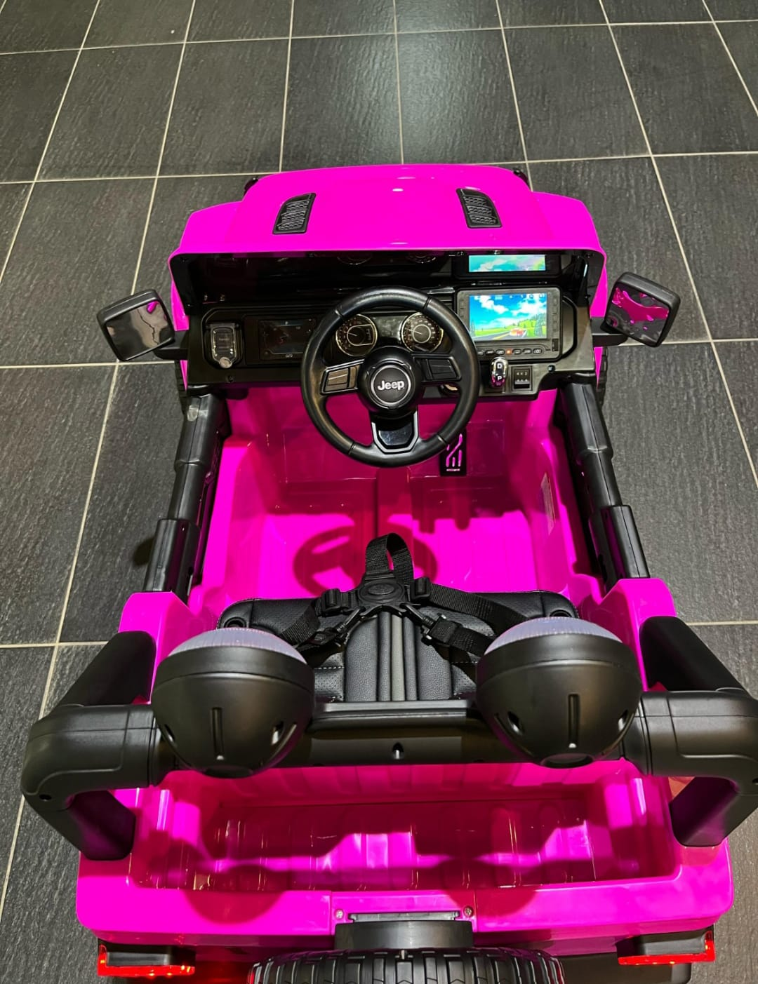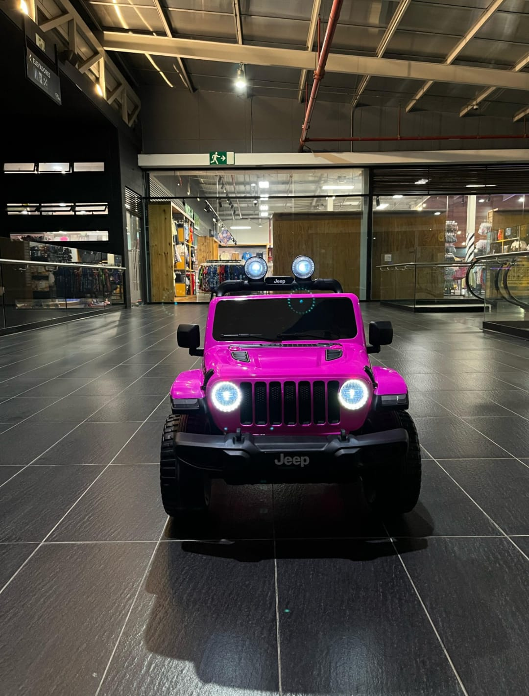 Este Jeep Rubicon fucsia ilumina cualquier aventura con sus luces brillantes, diseño atrevido y mucha actitud. Perfecto para peques que aman destacar, explorar y divertirse sin límites.